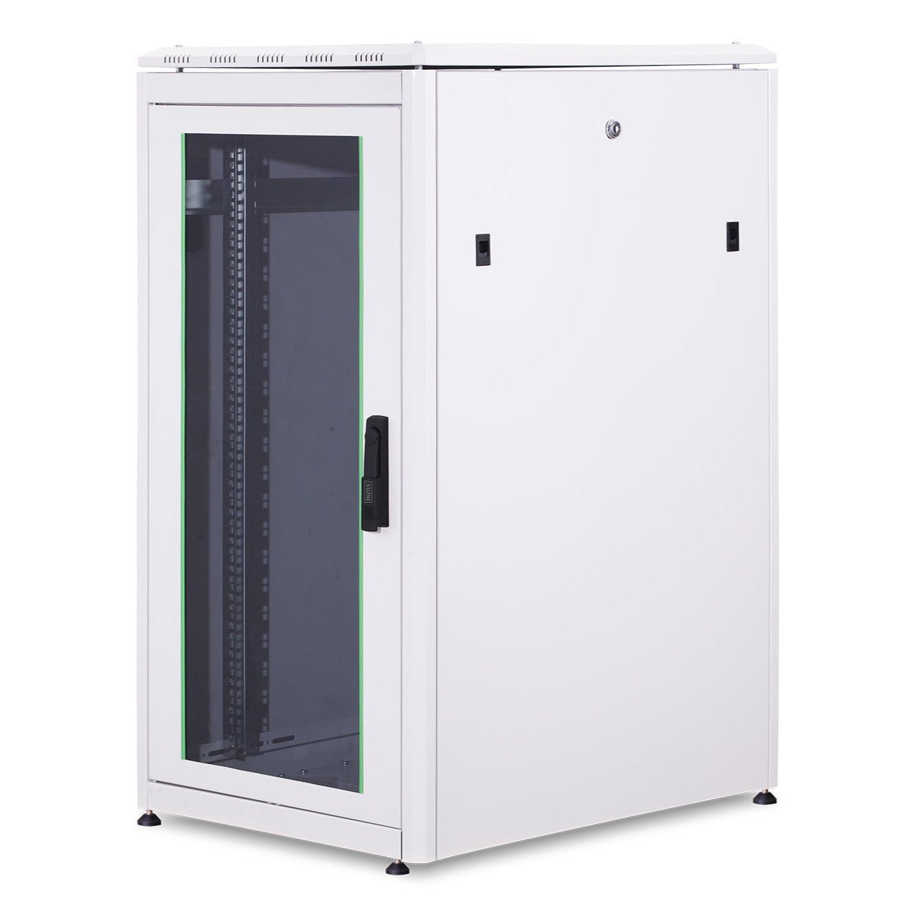 Onze patchkasten zijn ontworpen en geproduceerd voor bijzonder handige en flexibele netwerkbekabeling. Een modulair basischassis, dat kan worden geopend met behulp van vastgeschroefde blinde panelen van 483 mm (19\"), biedt voldoende ruimte voor alle soorten kabels. Ook zijn er kabelinvoeren met borstels aan de boven- en onderkant van de behuizing en nog een aan de achterkant van het basischassis. Borstelstrips aan de achterkant boven en onder de achterdeur (vanaf 26U) maken gebruik in een groot aantal toepassingsscenario's mogelijk. Royale verticale kabelkanalen met kabelgeleidinghulp en deksel, geïnstalleerd aan de voorkant (vanaf 800 mm kastbreedte), ronden de veelzijdige eigenschappen van de netwerkbehuizing perfect af. Binnenin zijn twee paar geslingerde en gegalvaniseerde 483 mm (19\") profielrails geïnstalleerd, voorzien van hoogte-eenheden die in tegengestelde richting kunnen worden afgelezen. Ze zijn traploos verstelbaar en verbonden met extra diepteschoren in de kast. Elke kast is een robuuste stalen constructie van maximaal 1,5 mm dik plaatstaal. De kleuren zijn elektrostatische poedercoating in de standaardkleuren grijs (RAL 7035) en zwart (RAL 9005). Modulaire afsluitbare en verwijderbare zijpanelen en deuren verbeteren de toegankelijkheid. Deurscharnieren kunnen worden vervangen. Bovendien kunnen de kasten indien nodig volledig worden gedemonteerd dankzij het demonteerbare ontwerp.