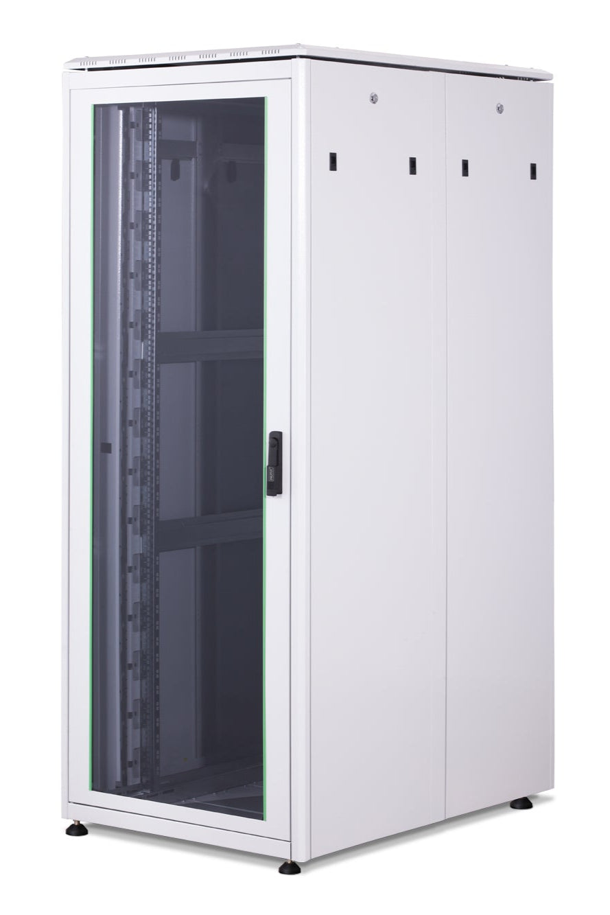 Onze patchkasten zijn ontworpen en geproduceerd voor bijzonder handige en flexibele netwerkbekabeling. Een modulair basischassis, dat kan worden geopend met behulp van vastgeschroefde blinde panelen van 483 mm (19\"), biedt voldoende ruimte voor alle soorten kabels. Ook zijn er kabelinvoeren met borstels aan de boven- en onderkant van de behuizing en nog een aan de achterkant van het basischassis. Borstelstrips aan de achterkant boven en onder de achterdeur (vanaf 26U) maken gebruik in een groot aantal toepassingsscenario's mogelijk. Royale verticale kabelkanalen met kabelgeleidinghulp en deksel, geïnstalleerd aan de voorkant (vanaf 800 mm kastbreedte), ronden de veelzijdige eigenschappen van de netwerkbehuizing perfect af. Binnenin zijn twee paar geslingerde en gegalvaniseerde 483 mm (19\") profielrails geïnstalleerd, voorzien van hoogte-eenheden die in tegengestelde richting kunnen worden afgelezen. Ze zijn traploos verstelbaar en verbonden met extra diepteschoren in de kast. Elke kast is een robuuste stalen constructie van maximaal 1,5 mm dik plaatstaal. De kleuren zijn elektrostatische poedercoating in de standaardkleuren grijs (RAL 7035) en zwart (RAL 9005). Modulaire afsluitbare en verwijderbare zijpanelen en deuren verbeteren de toegankelijkheid. Deurscharnieren kunnen worden vervangen. Bovendien kunnen de kasten indien nodig volledig worden gedemonteerd dankzij het demonteerbare ontwerp.